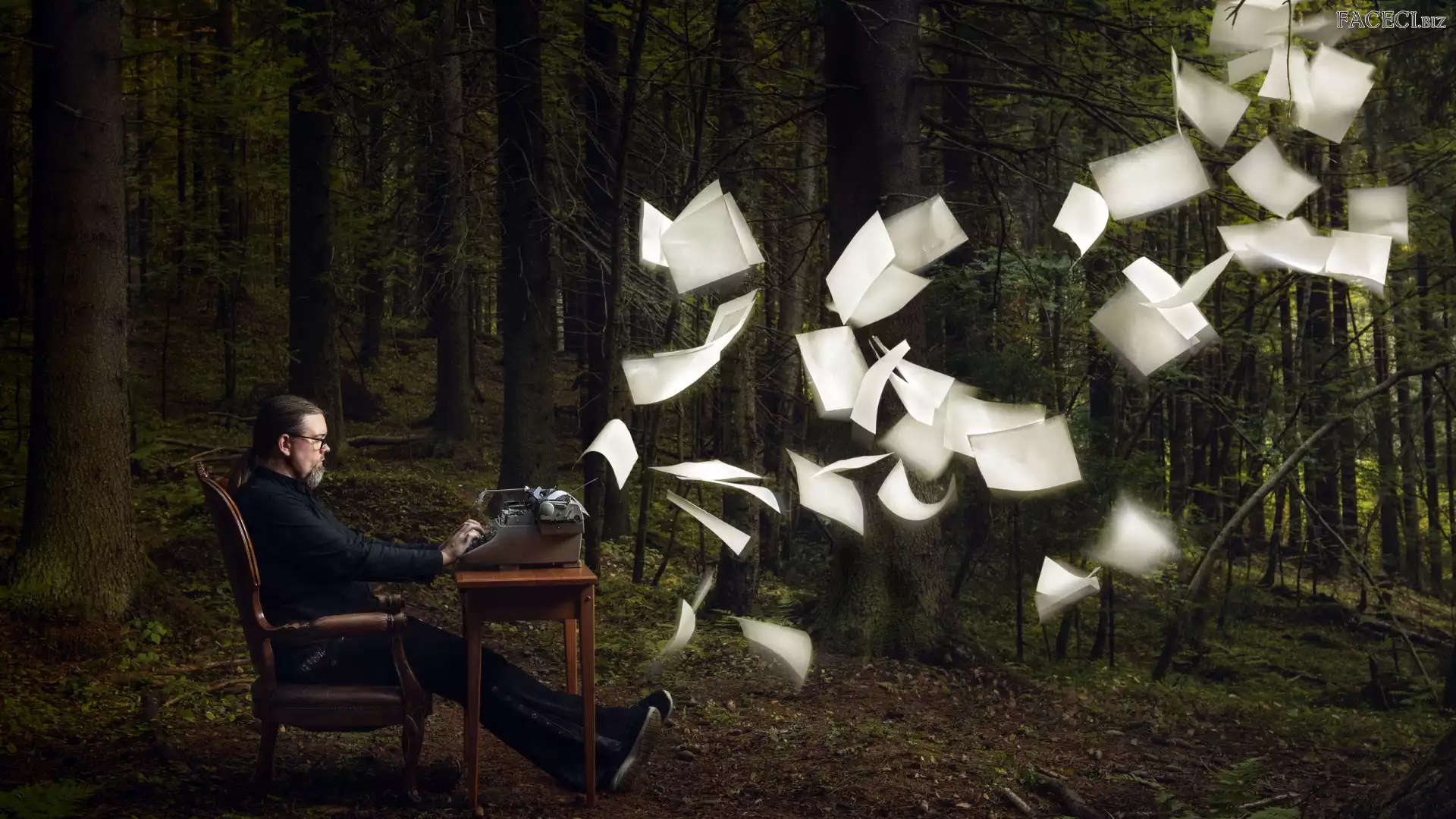 Kartki, Maszyna do pisania, Mężczyzna, Las, Drzewa - faceci.biz
